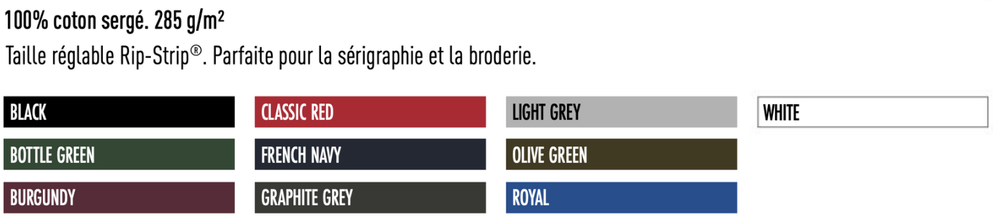 Étiquette détachable TearAway, facile à ré-étiqueter. 6 panneaux. Visière préformée. Oeillets de ventilation. Parfaite pour l’impression et la broderie. Taille réglable Rip-Strip™.Taille tour de tête : 57 – 59 cm